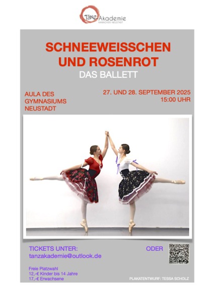 Am 27. und 28. September zeigen wir jeweils um 15:00 Uhr unser Kinderballett "Schneeweißchen und Rosenrot" auf der Bühne des Gymnasiums Neustadt. Es gibt noch wenige Restkarten (Erwachsene 17,-€,